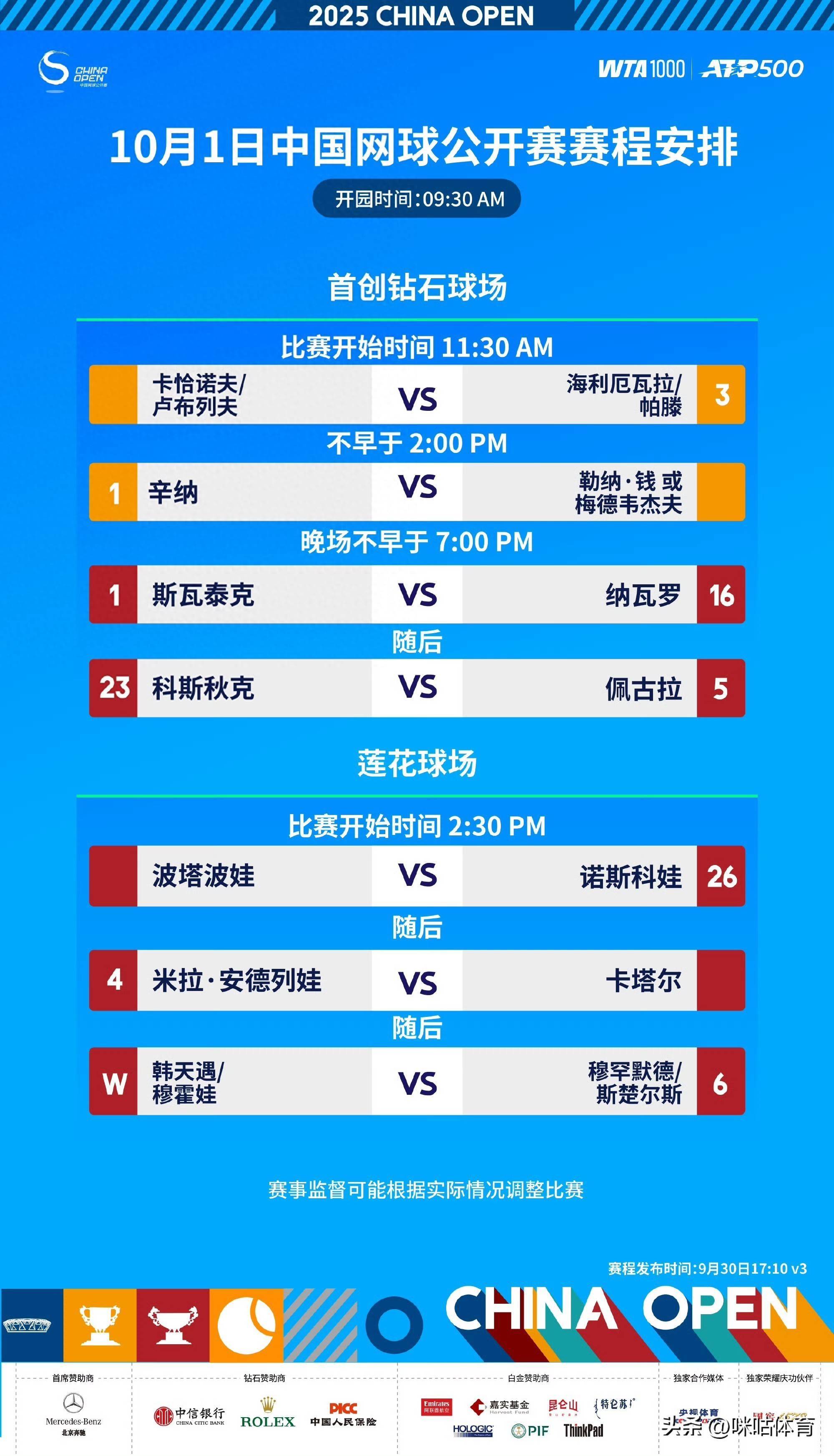 10月1日体育集锦,2025中国网球公开赛将迎来男单、男双决赛的争夺。女片面,斯瓦泰克、佩古拉、米拉-安德列娃等前十球员将向八强发起冲击。