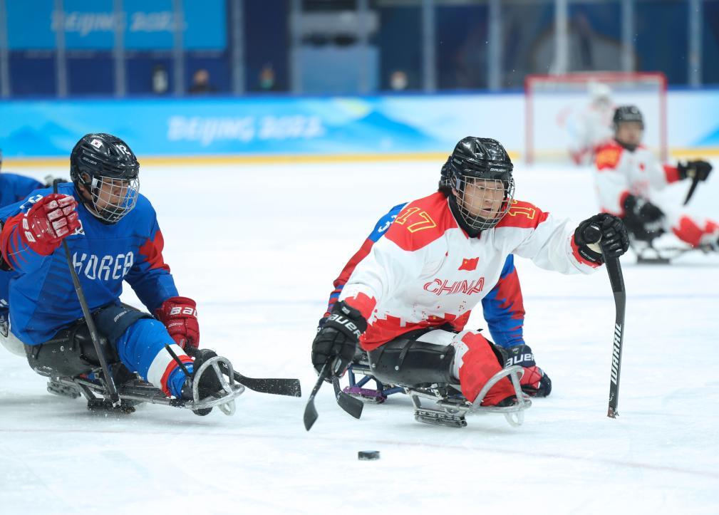 2022年3月12日,在北京国度体育馆举行的北京2022冬残奥会残奥冰球铜牌赛中,中国队以4:0慑服韩国队赢得铜牌,图为申翼风(右)在比赛中精深。新华社记者 兰红光 摄