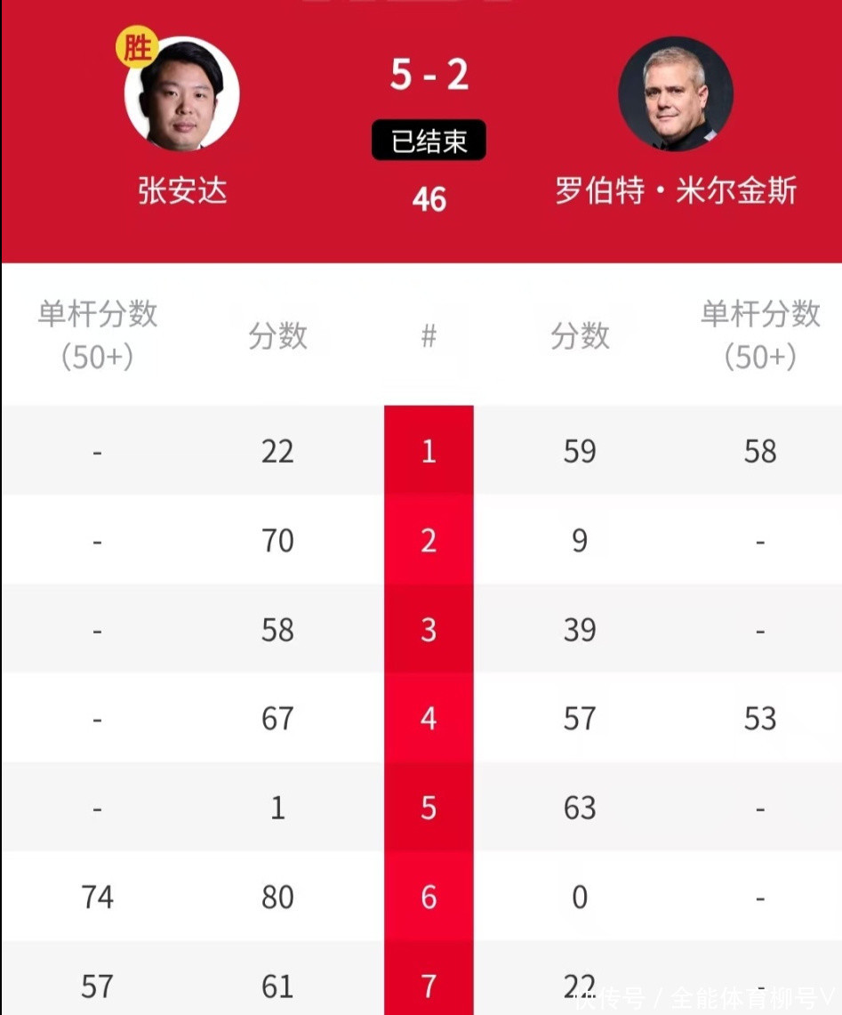 这场比赛前三局,周金豪3-0梦境开局,张安达扳回一局后,周金豪又连胜两局,5-1获得四个赛点,前六局的具体比分为:82-34、54-36、75-1、41-95(63)、80(76)-0、68-5。