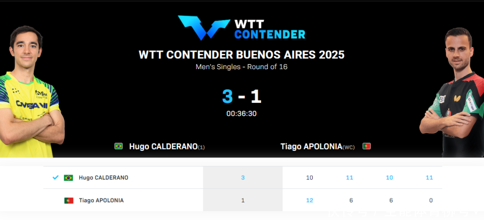 阿波罗尼亚在第一轮与日本选手滨田一辉的比赛中,以3-2逆转晋级。来到第二轮,雨果以3-1松弛征服阿波罗尼亚,并在第四局轰出11-0的悬殊比分。