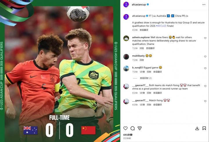 直播吧09月09日讯 U22国足0-0战平澳大利亚,赛后亚足联发文论述战果。