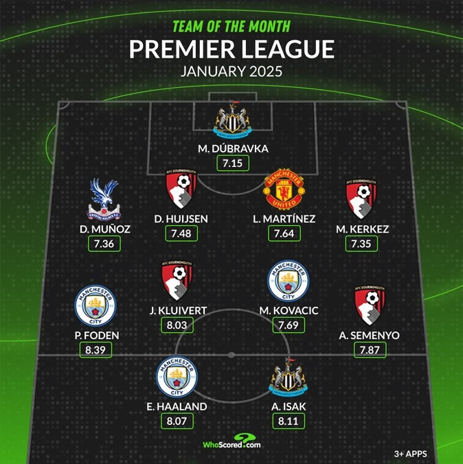 直播吧1月28日讯WhoScored把柄球员的场均评分列出英超1月最好气势,哈兰德、福登、伊萨克、利桑德罗在列。
